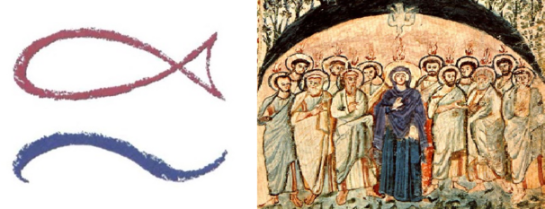 Der biblischen Erzählung zufolge erscheinen über den Köpfen der Jünger kleine Feuerflammen. Sie verlassen das Haus und beginnen auf der Straße zu predigen.
