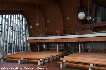 Bis heute vermittelt der Kirchraum eine Mischung aus Offenheit und Beheimatung. Der weiße Altarraum wird morgens (bei entsprechendem Wetter) durch das große Oberlicht von der Sonne durchflutet. Die gebogene Betonschale ist mit bunten Mosaikfenstern und einem Buntglasmosaik des Auferstandenen geschmückt, die der Quelkhorner Künstlers Erhart Mitzlaff entworfen hat. Taufbecken, Kerzenleuchter und Kanzel, gestiftet von dem Kunstschmied Hermann Carl Rippe, fügen sich harmonisch in den Altarraum ein. Und von der Empore erklingt im Gottesdienst die 1960 von Alfred Führer gebaute und 1976 von Rudolf Janke überarbeitete Orgel. Seit 2017 sind Kirche und Gemeindezentrum samt Glockenturm denkmalgeschützt.