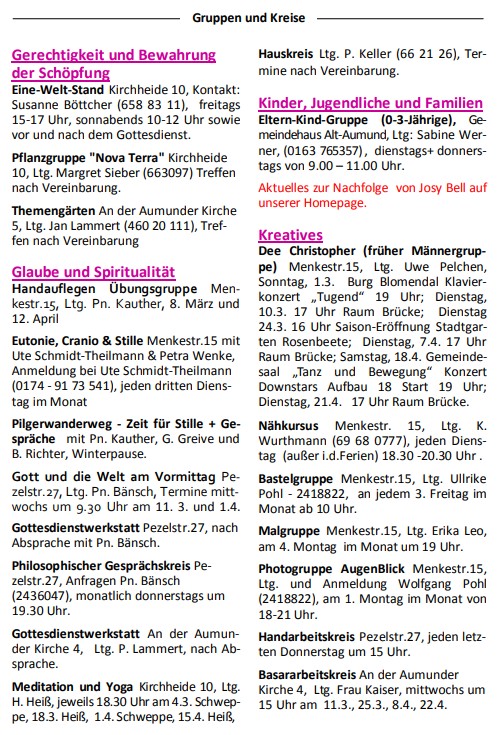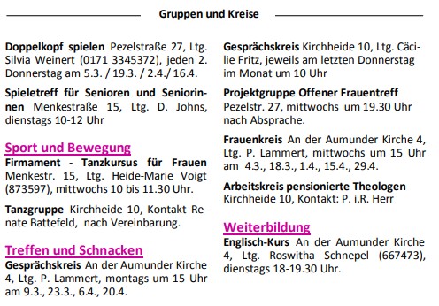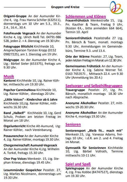 Nachfolgend sind unsere regelmäßigen Gruppen und Kreise aufgeführt. Aktuelle Themen und Termine erfahren Sie hier auf unserer Website, im Gemeindebrief oder auch über Instagram.