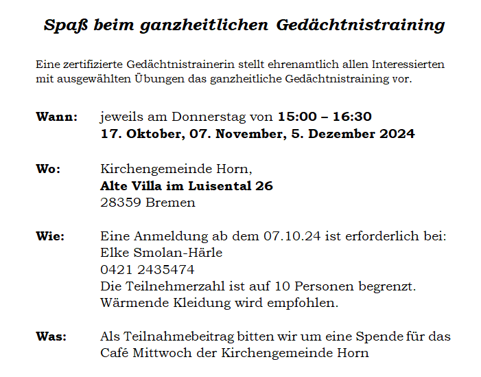 Jeweils im Herbst und Frühjahr gibt es im Gemeindehaus Luisental die Möglichkeit, mit ausgewählte Übungen das ganzheitlichen Gedächtnistraining kennenzulernen.