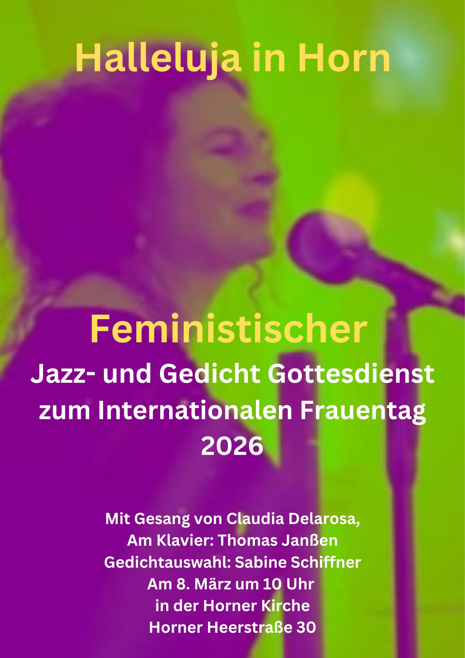 Anlässlich des Internationalen Frauentages 2026 findet in der Horner Kirche ein Feministischer Jazz- und Gedichtgottesdienst statt. Thema des Gottesdienstes ist das Halleluja von Leonard Cohen. Gedichte, Gebete und Segenssprüche stammen von zeitgenössischen und verstorbenen Dichterinnen. Dazu wird die Bremer Jazzsängerin Claudia Delarosa mit dem Pianisten Thomas Janssen singen. Die Gedichtauswahl stammt von der Bremer Autorin Sabine Schiffner, die den Gottesdienst gemeinsam mit Pastor Stephan Klimm gestaltet. Beginn ist um 10 Uhr.