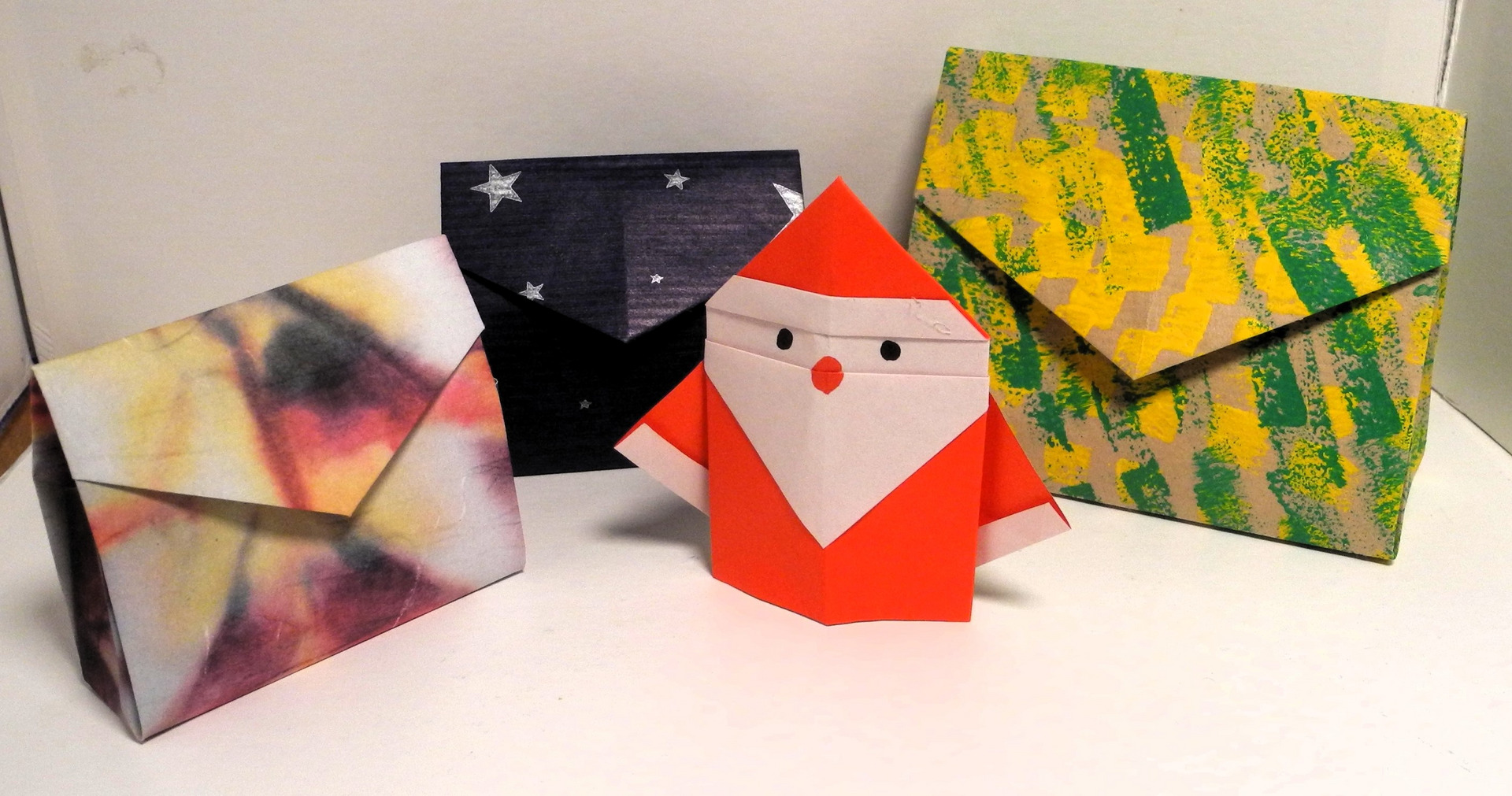 Die Tasche wird aus einen Blatt Papier gefaltet und ist auch geeignet für einen Adventskalender. Der Weihnachtsmann wird ebenfalls aus einem Blatt gefaltet und kann aufgestellt werden, aber er eignet sich auch gut für eine Weihnachtskarte. Beide Modelle sind leicht zu falten, damit sind beide Modelle auch für Anfänger und wenig Geübte geeignet. Jedermann und jedefrau, Schulkinder mit Eltern oder Großeltern, Jugendliche sind willkommen.