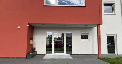 Eingang zu einem modernen Gebäude mit großen, gläsernen Doppeltüren. Neben der Tür sind einige Schilder angebracht. Im Fenster sind Schuhe sichtbar. Die Fassade ist hellgrau mit einem pinken Akzent. Teilen des oberen Bereichs sind mit Holz verkleidet.