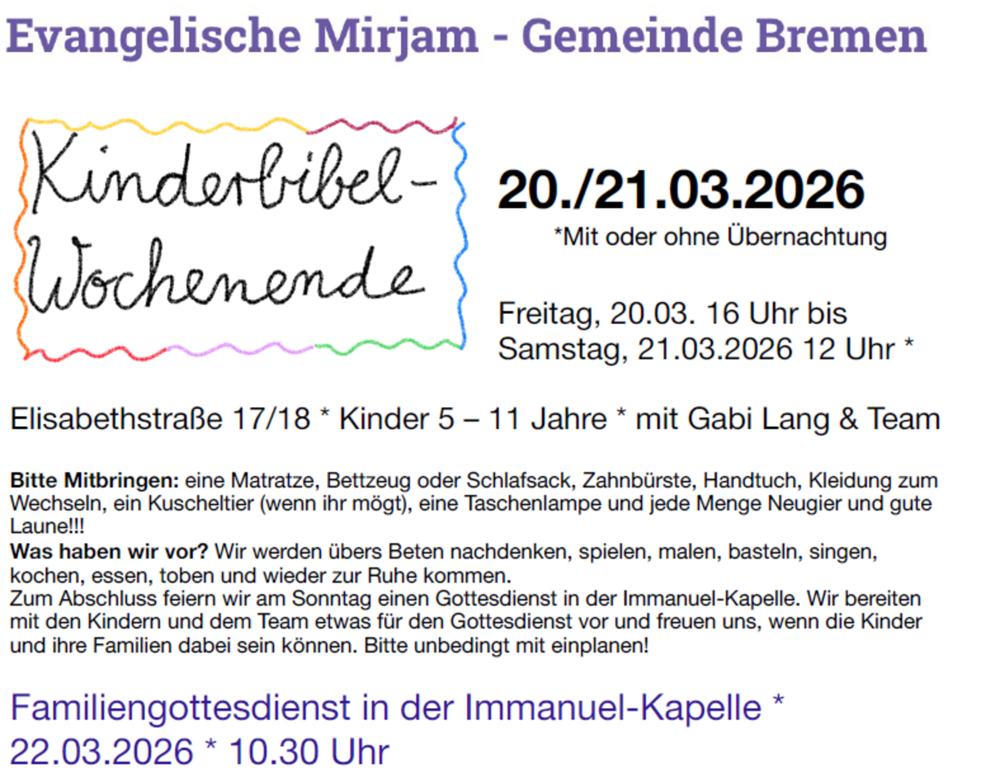 Dazu kommt ein bunter Familiengottesdienst am 22.03. um 10.30 Uhr. Gabi Lang & Team