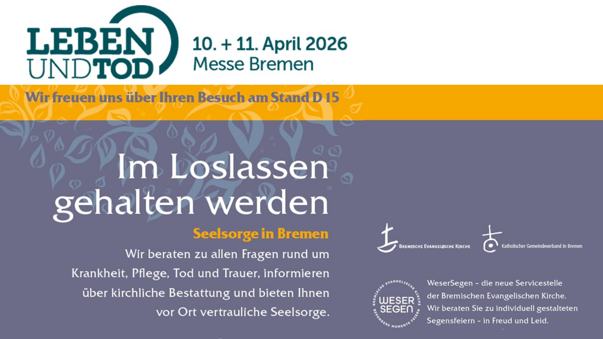 Erstmalig ist auch die neue Servicestelle WeserSegen der Bremischen Evangelischen Kirche vertreten, die bei der individuellen Gestaltung von Segensfeiern unterstützt - in Freud und Leid.