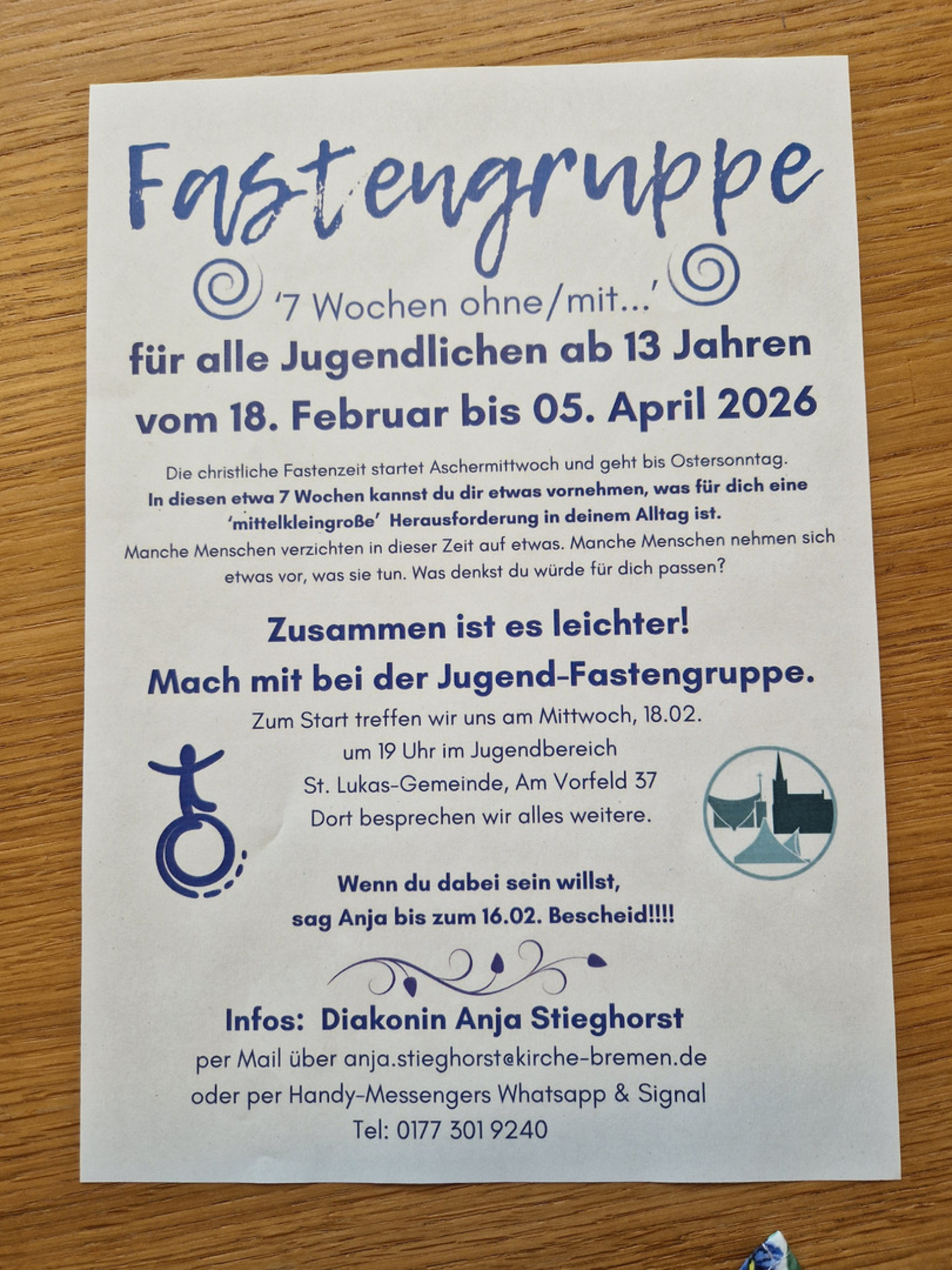 Ort der Veranstaltung: Ev. Kirchengemeinde St. Lukas - Gemeindehaus, Jugendbereich | Am Vorfeld 22, 28259 Bremen