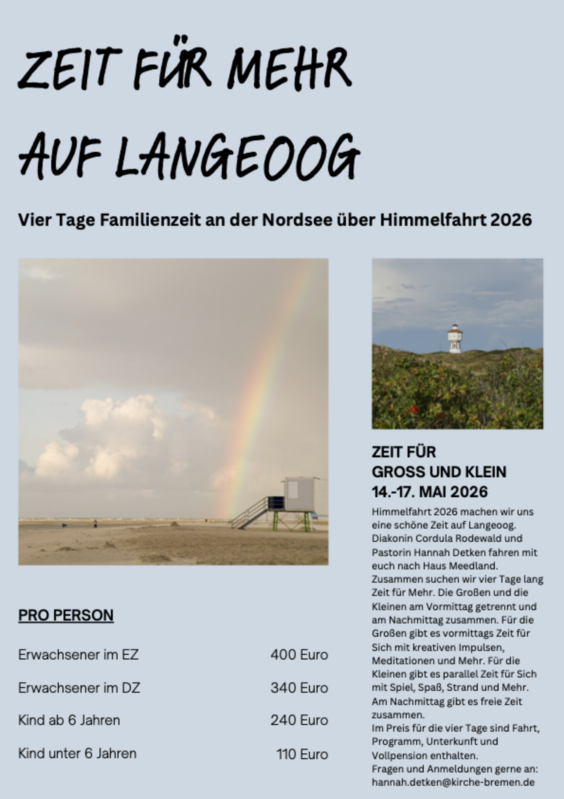Himmelfahrt 2026 machen wir uns eine schöne Zeit auf Langeoog. Diakonin Cordula Rodewald und Pastorin Hannah Detken fahren mit euch nach Haus Meedland. Zusammen suchen wir vier Tage lang Zeit für Mehr. Die Großen und die Kleinen am Vormittag getrennt und am Nachmittag zusammen. Für die Großen gibt es vormittags Zeit für Sich mit kreativen Impulsen, Meditationen und Mehr. Für die Kleinen gibt es parallel Zeit für Sich mit Spiel, Spaß, Strand und Mehr. Am Nachmittag gibt es freie Zeit zusammen. Im Preis für die vier Tage sind Fahrt, Programm, Unterkunft und Vollpension enthalten.