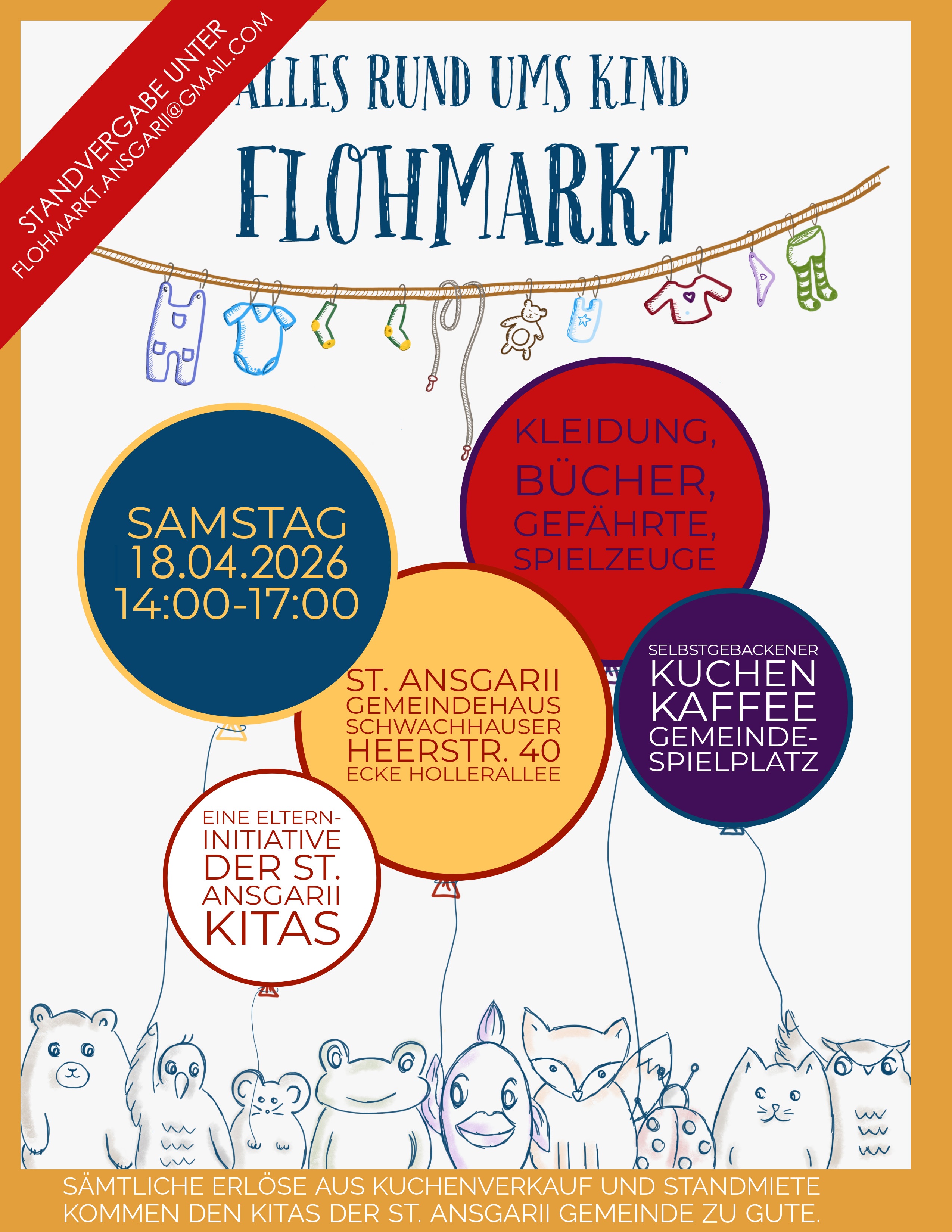 Standvergabe unter flohmarkt.ansgarii@gmail.com unter Angabe von Vor- und Zuname, Verkaufstisch ist selbst mitzubringen. Standgebühr sind 15€ und eine Kuchenspende.