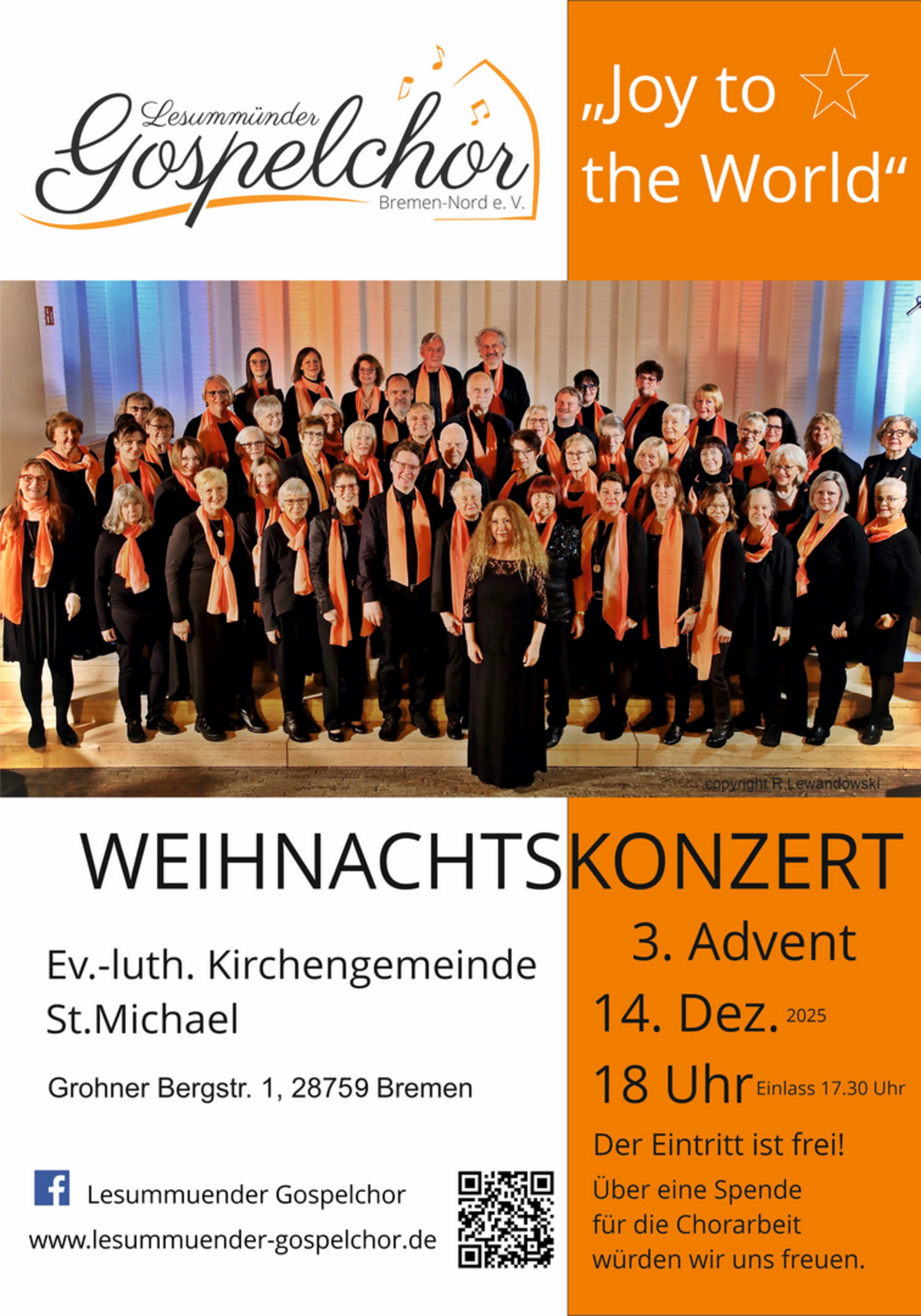 Der Lesummünder Gospelchor Bremen Nord e.V. und seine Chorleiterin Marlies Nicolmann laden ein zu einem Weihnachtskonzert. Unter dem Motto: Joy to the World, ist der Chor am 3. Adventsonntag, 14. Dezember 2025 in St. Michael Grohn zu Gast. Beginn: 18 Uhr, Einlass ab 17.30 Uhr. Gesungen werden weihnachtliche Gospels – traditionelle Spirituals als auch zeitgenössisch.„Singen in einer Chorgemeinschaft ist wunderbar und Gospels eine Bereicherung. Wir möchten eine Botschaft weitergeben und die Herzen der Menschen berühren“, so ein persönliches Fazit. Der Eintritt zu dem Konzert ist frei, eine Spende für die Chorarbeit ist erwünscht.