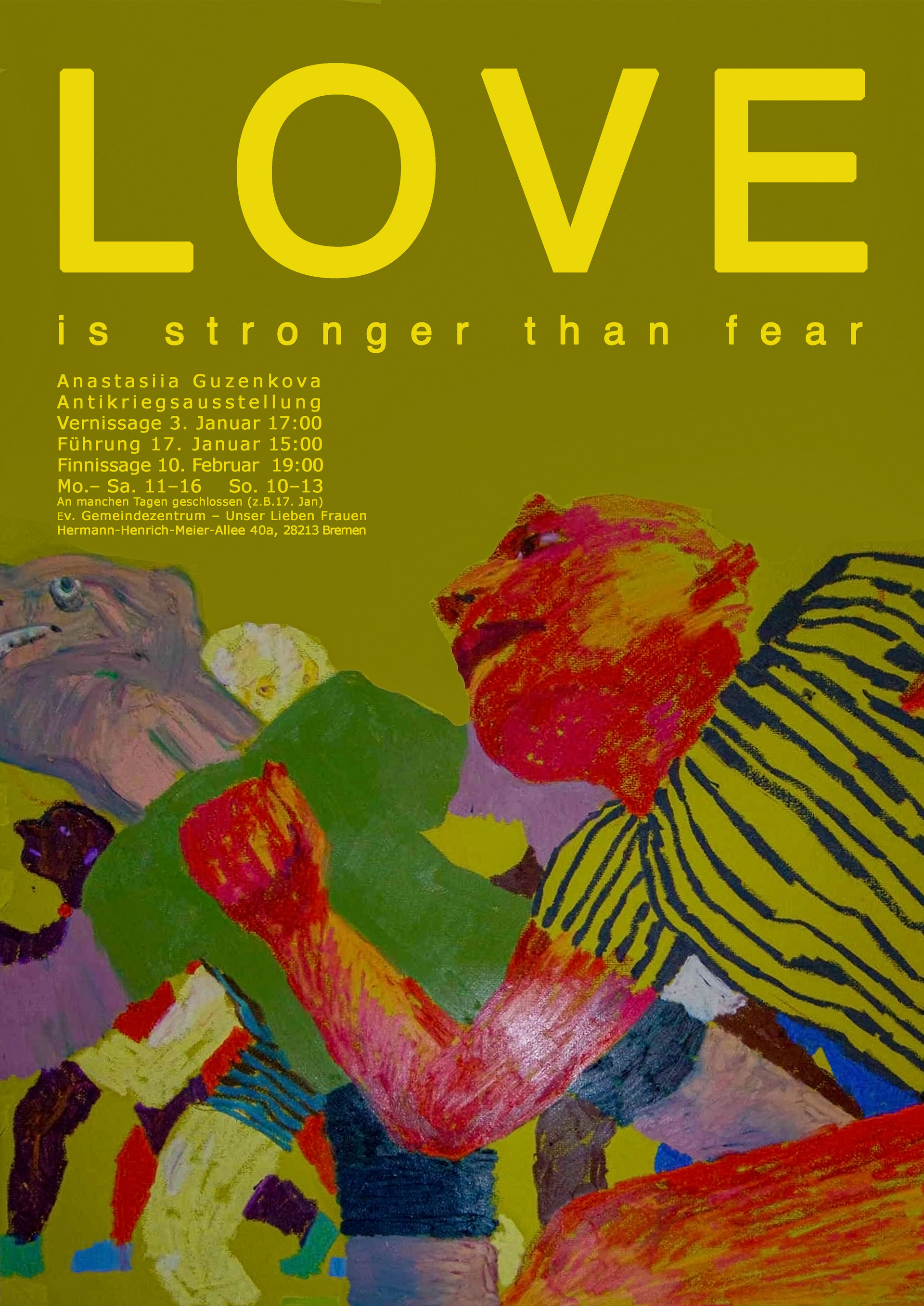 Anastasiia Guzenkova wird vom 3. Januar bis 10. Februar ihre AntikriegAusstellung „LOVE is stronger than fear “ in der Unser Lieben Frauen Kirche zeigen. Anastasiia lebt und absolviert in Kürze ihr Studium an der Hochschule für Künste in Bremen.