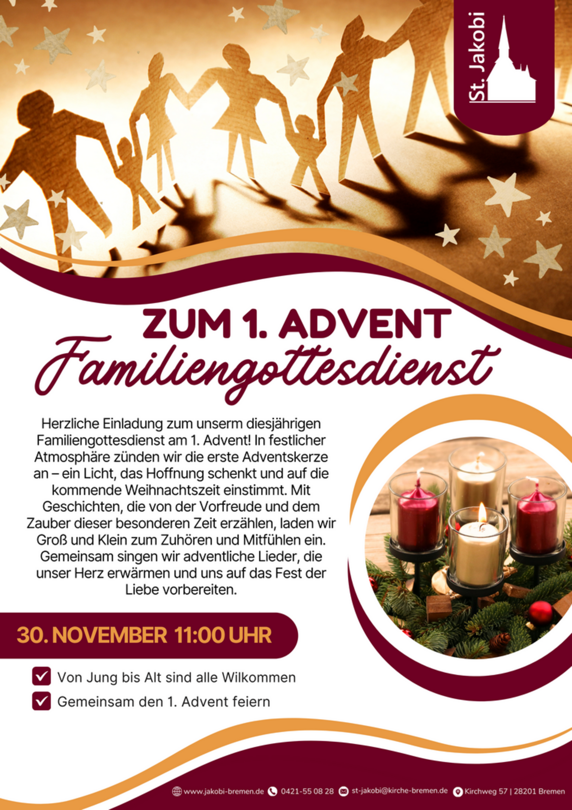 Am 30. November um 11 Uhr laden wir alle Kinder, Eltern, Großeltern und Freunde herzlich ein, den ersten Advent gemeinsam in der St. Jakobikirche zu feiern.