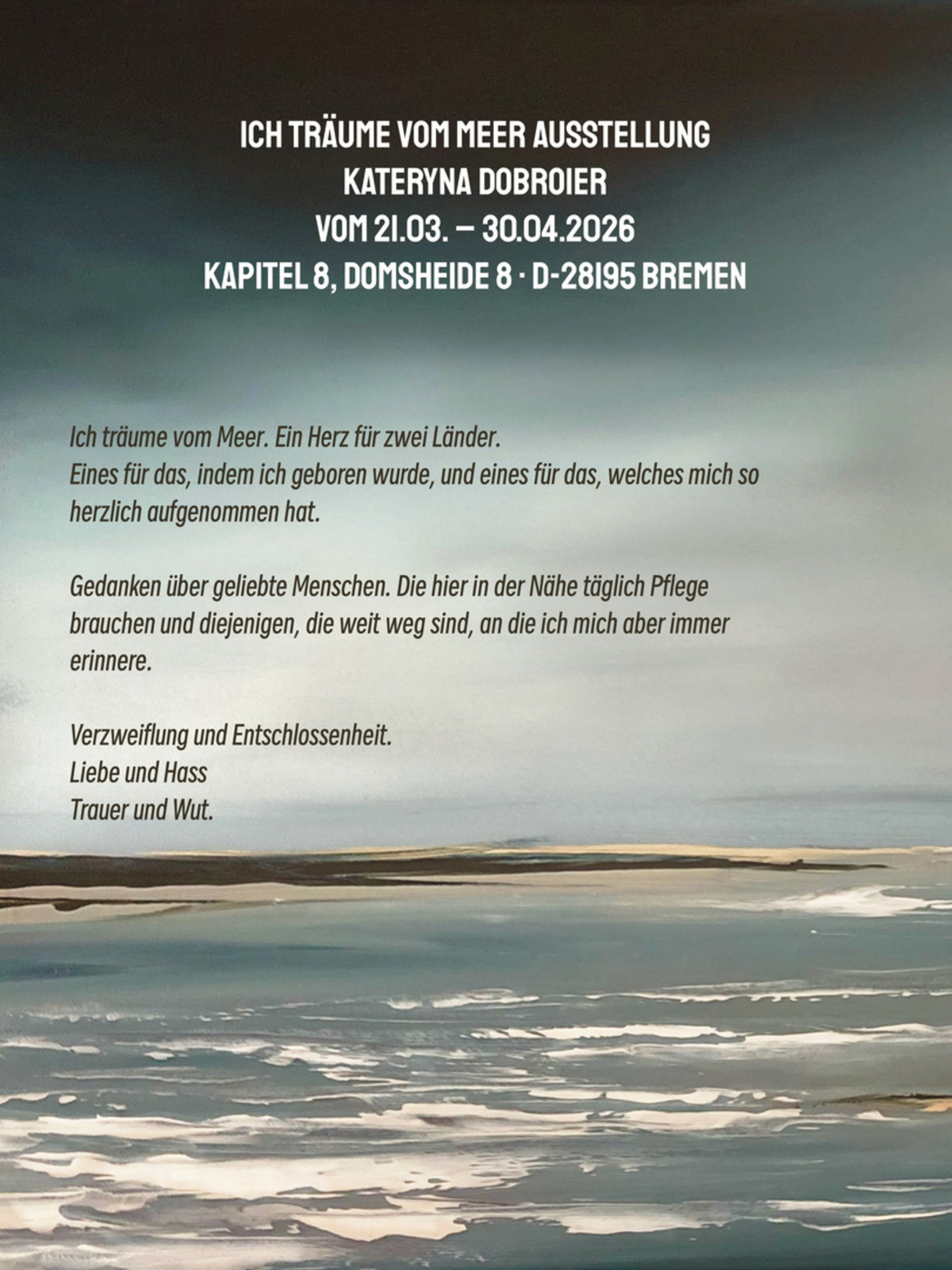 „Der Krieg teilt alles in zwei Hälften. Das Leben ‚vor‘ und ‚nach‘ der groß angelegten Invasion.“ Sagt Kateryna Dobroier, die in Odessa, in der Ukraine, geboren wurde und dort aufgewachsen ist. Sie sagt: „Jetzt drücke ich meine Gefühle, besonders meine Sehnsucht nach dem Meer, durch meine Kunst aus.“