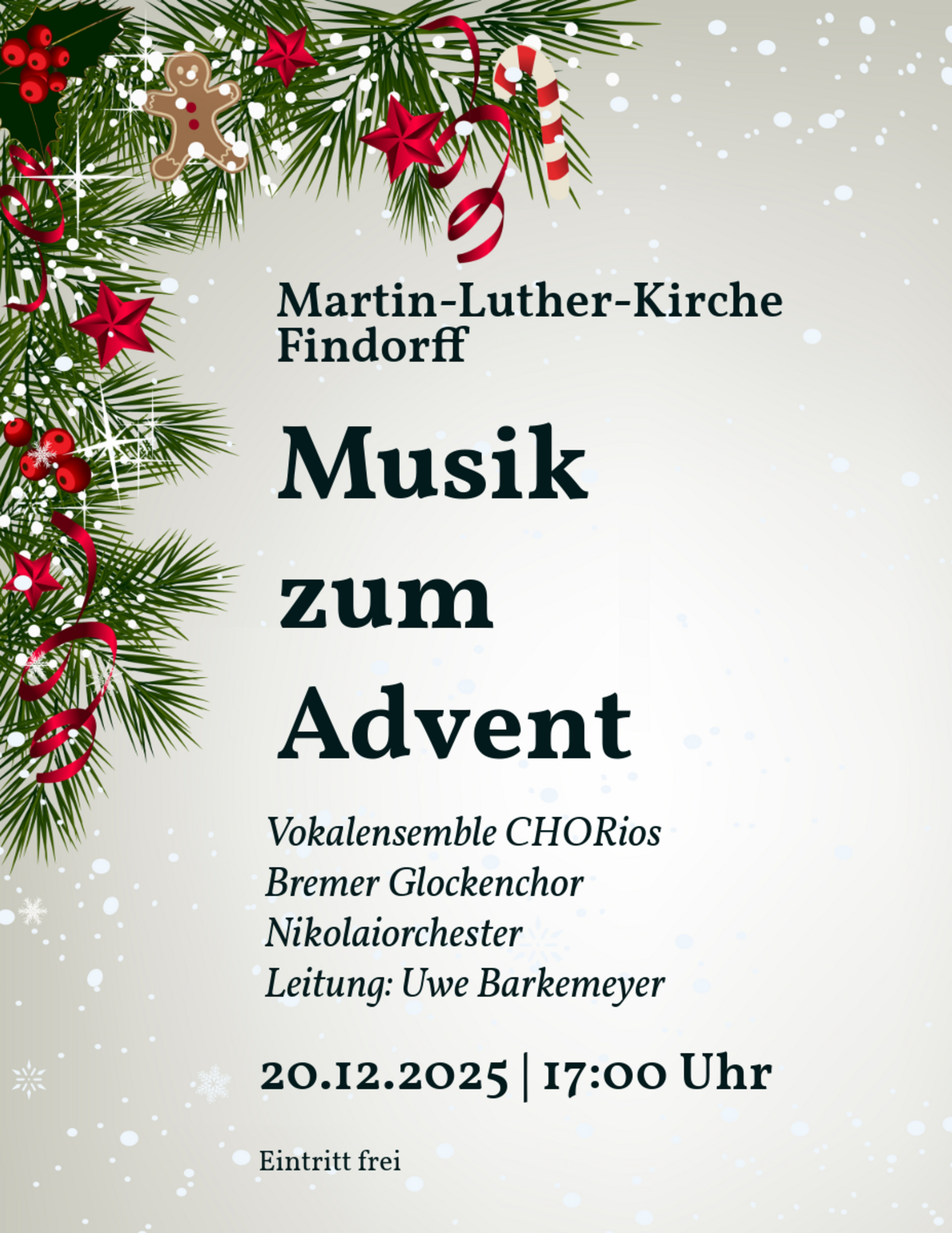 Unter der Leitung von Uwe Barkemeyer laden das Vokalensemble „CHORios“, der Bremer Glockenchor und ein kleines Streichorchester zu einem abwechslungsreichen Adventskonzert ein.
