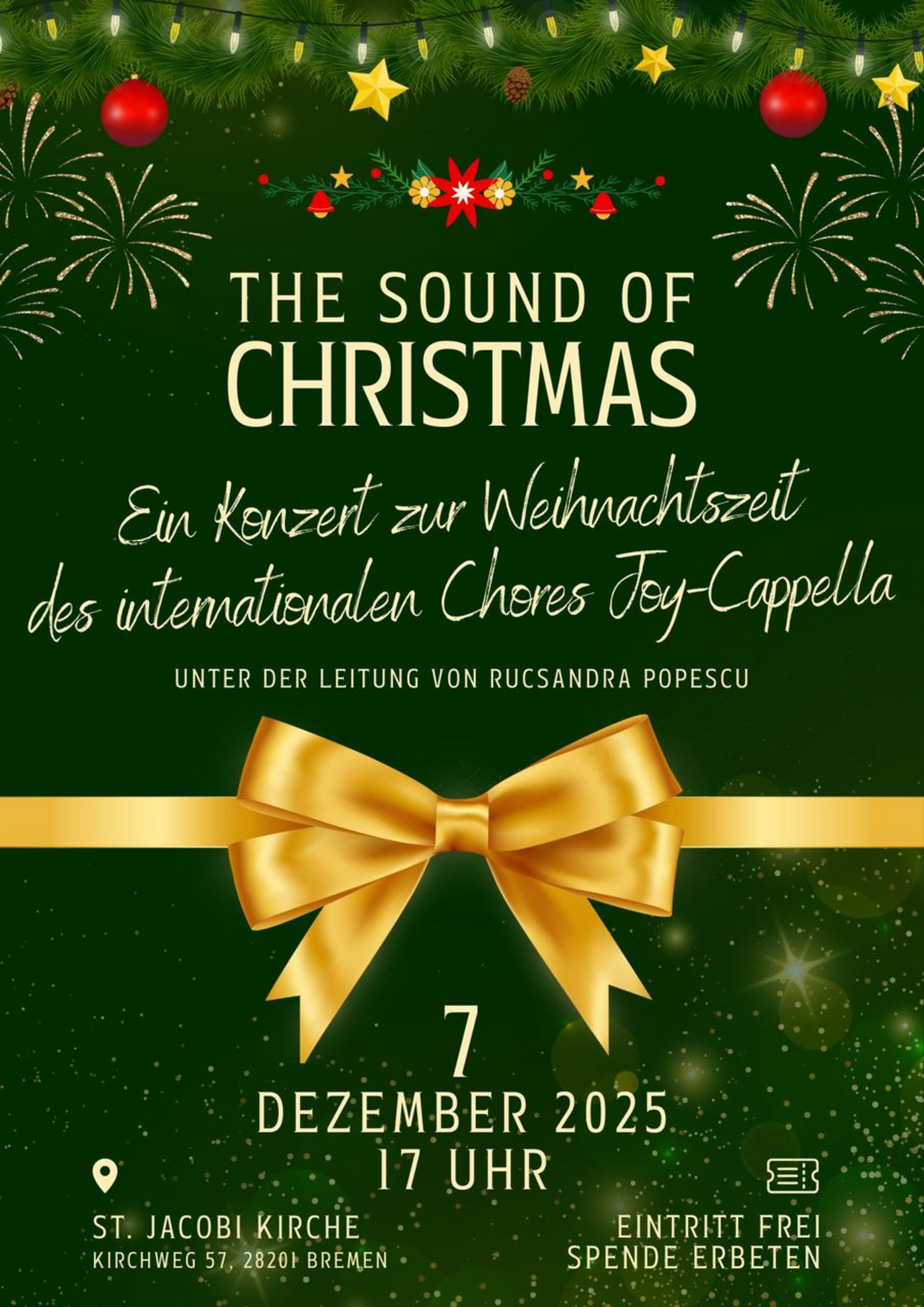 Unter der Leitung von Rucsandra Popescu lädt der internationale Chor Joy-Cappella (ehemals J-Cappella Choir) am Sonntag, den 7. Dezember, um 17 Uhr herzlich zu seinem festlichen Weihnachtskonzert in die St.-Jakobi-Kirche ein.